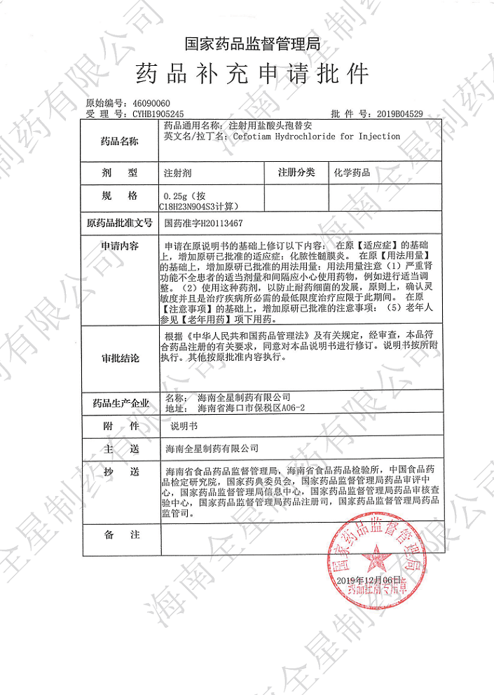 經(jīng)過公司研發(fā)團隊長期循證醫(yī)學研究,并結(jié)合上市原研藥品使用說明書,我公司向國家藥品監(jiān)督管理局提交的注射用奧美拉唑鈉、注射用鹽酸頭孢替安(4種規(guī)格)和注射用頭孢呋辛鈉(3種規(guī)格)適應癥的補充申請近日獲得批準,新核準的藥品使用說明書拓展了臨時用藥范圍,用法用量描述更詳細更為安全,提供了更加嚴謹?shù)挠盟幰罁?jù),有助于臨床醫(yī)生在一線工作中制定出更準確、更有效、更有針對性的治療方案。今后,公司將繼續(xù)提高研發(fā)力量,加強技術(shù)生產(chǎn)工藝,嚴把質(zhì)量關(guān)口,為市場提供更多高品質(zhì)、高標準的優(yōu)質(zhì)產(chǎn)品,為2030年健康夢中國夢添磚加瓦,獻上我司的一份努力。